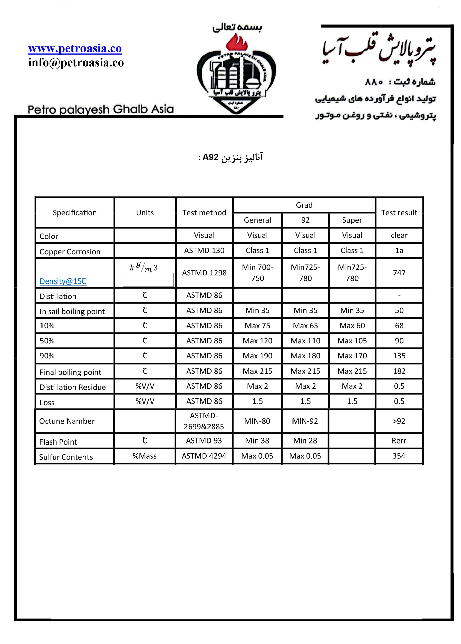 • بنزین A92 شرکت پتروپالایش قلب آسیا